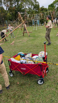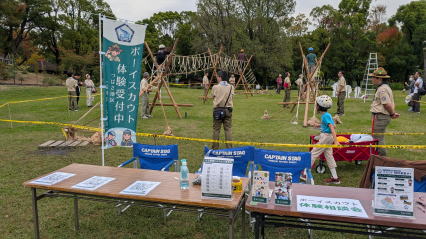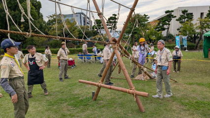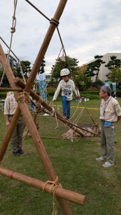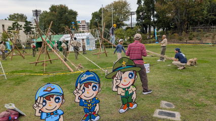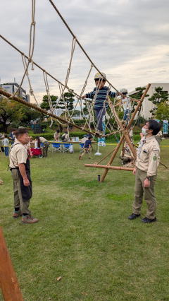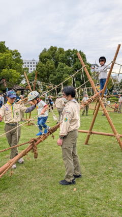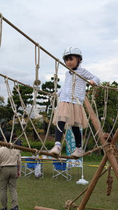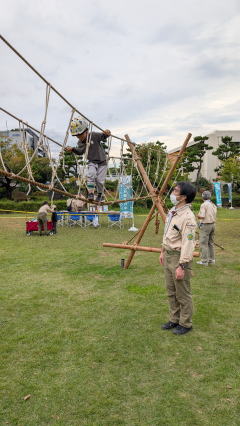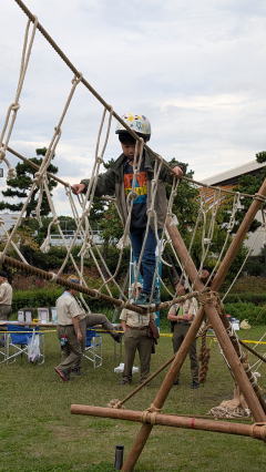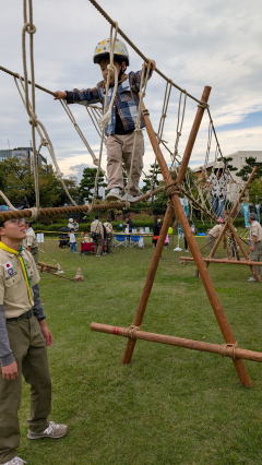 2025年11月1日〜2日、平和の森公園にて、大田ふれあいフェスタが開催されました。 ボーイスカウトつばさ地区では、恒例のモンキーブリッジを作成し、子どもたちが渡って遊びました。 子どもたちには好評で、何度もモンキーブリッジを渡る子もいました。 |